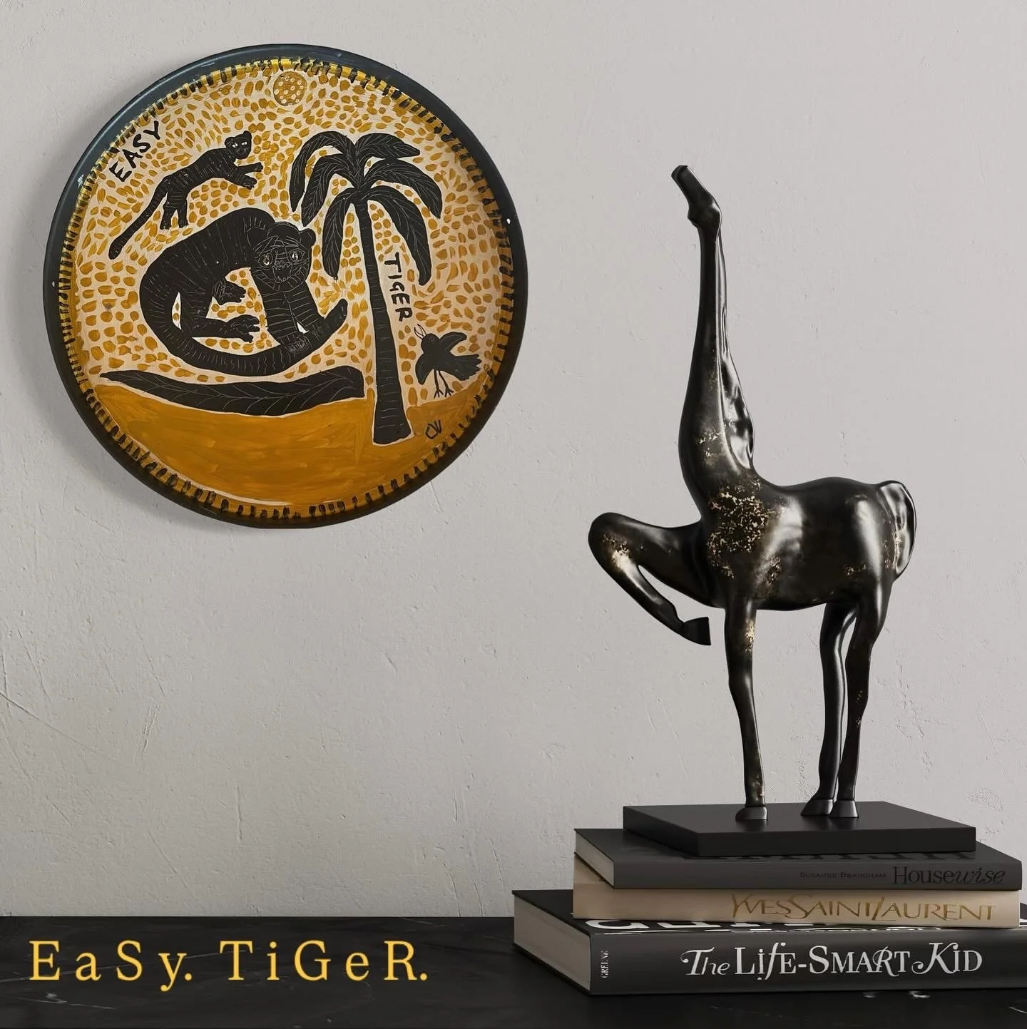 E a S y . T i G e R. 35cm diameter. paint & wax on recycled metal tray.